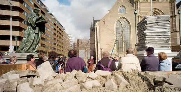Van oktober 2008 tot oktober 2009 heeft elke 4 a 5 weken een hedendaagse denker, staande in het spanningsveld tussen de twee standbeelden, een antwoord gegeven op de vraagstelling van het project. Dat antwoord werd verpakt in een korte prikkelende toespraak, een column. Na het uitspreken van de column was er een kleine act om de visie van de sprekers te ondersteunen. Het project vond plaats tijdens de herinrichting van het Grotekerkplein en op werktijden. Dit onderstreepte de technische conditie van de mens en dat de toekomst niet gratuit is, het vergt een (denk)inspanning. Voor video's de columns klik hier. Eind mei 2010 is het REBOOT-boek verschenen.